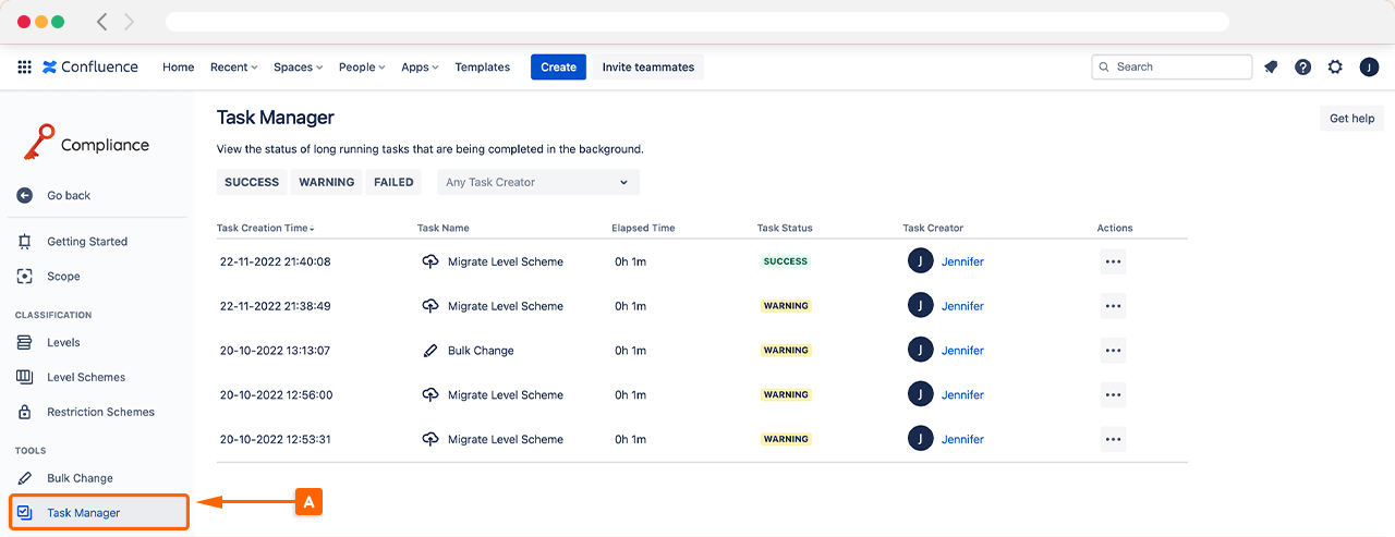 To mitigate the risk of large-scale changes causing performance issues, we have introduced a Task Manager into this version of Compliance for Confluence.