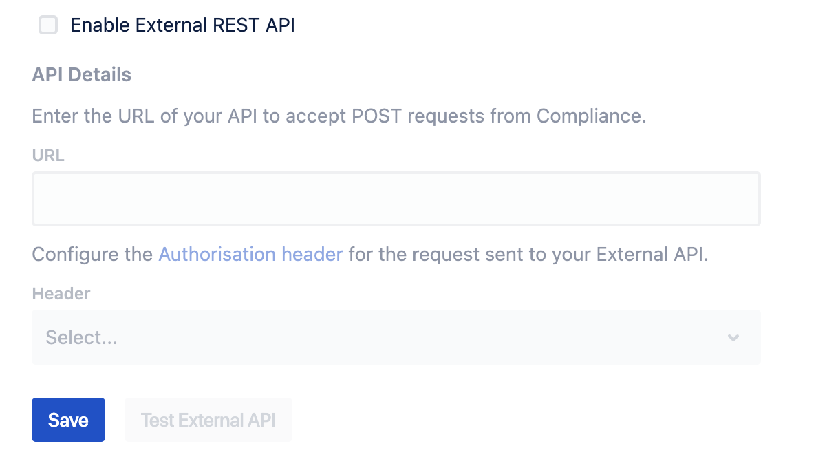 At the bottom of the External API page, toggle the Enable External REST API checkbox.