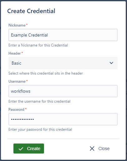 The Credential Manager allows you to securely store any API tokens or Basic Authentication to be used in your Webhook. Once you have created your credential you can then use it in your Authenticated Webhook Action.