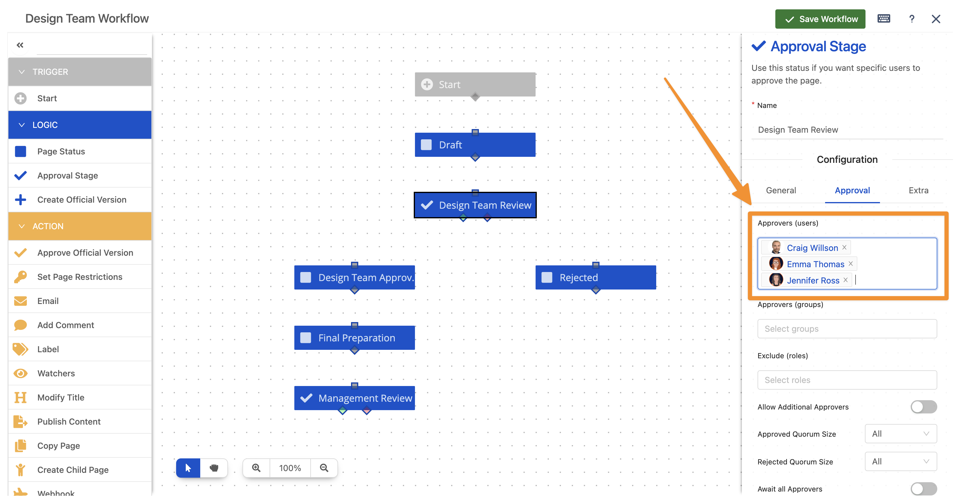 Once we have added the Approval Stage and remaining Page Statuses, its time to add the approvers to the workflow. You can do this by clicking on the Approval Stage and adding the users or groups within the right-hand configuration settings.