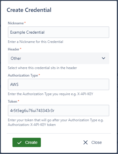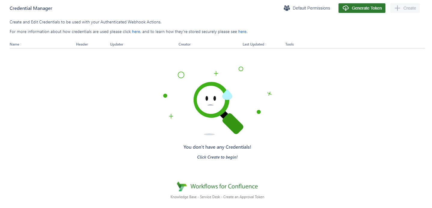 Once you have created a token you will now be able to select Create and begin adding your first credential.