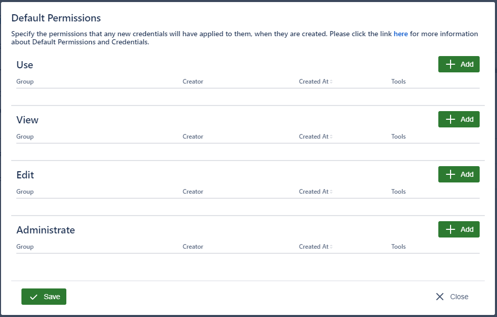 Once you have set your Defaults, click on the Save button to save them permissions. Now every time you create a new Credential they will have these permissions set.