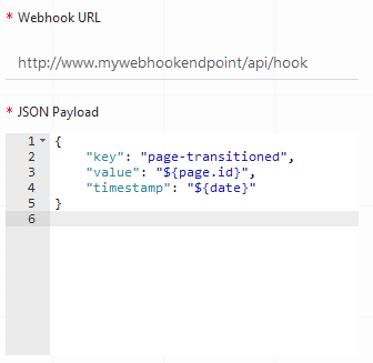 Here is an example of a Webhook, note the JSON format you are entering. The Keys must be wrapped in quotations and and Page Variables you wish to add must be wrapped in quotes too.