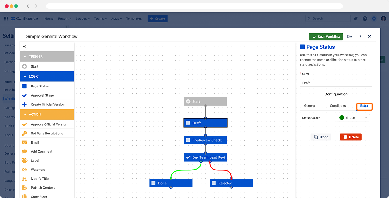 The Extra tab allows you to select the colour for this status in the workflow. This colour will appear on the Confluence page once the workflow reaches this status