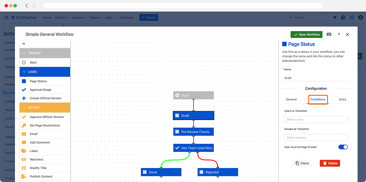Conditions allow you to control which users or groups can transition pages to the next stage of a workflow once it's in the status.