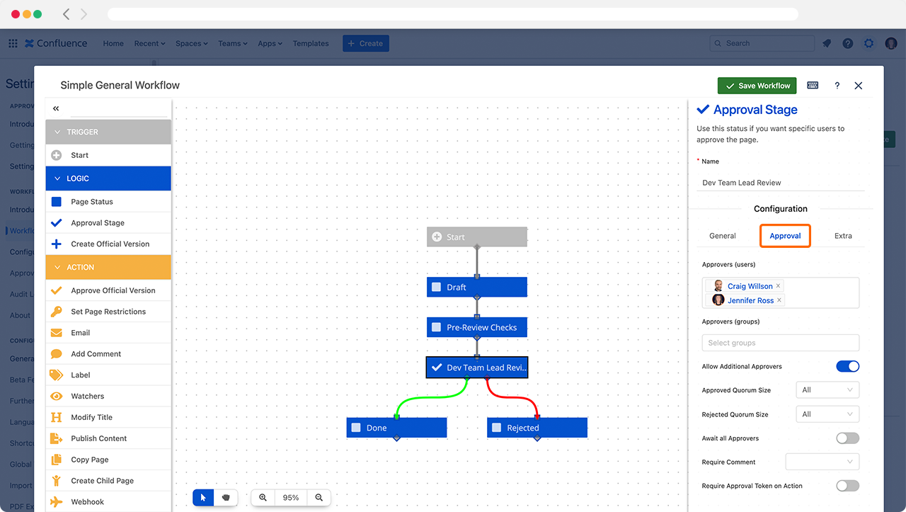 Here is the default configuration that comes with the Workflow. You need to set the Approvers (groups/users) that you need to approve the page at this status. In addition to this you need to set the Quorum Size to be the total number of approvals needed to transition to the Approved status.