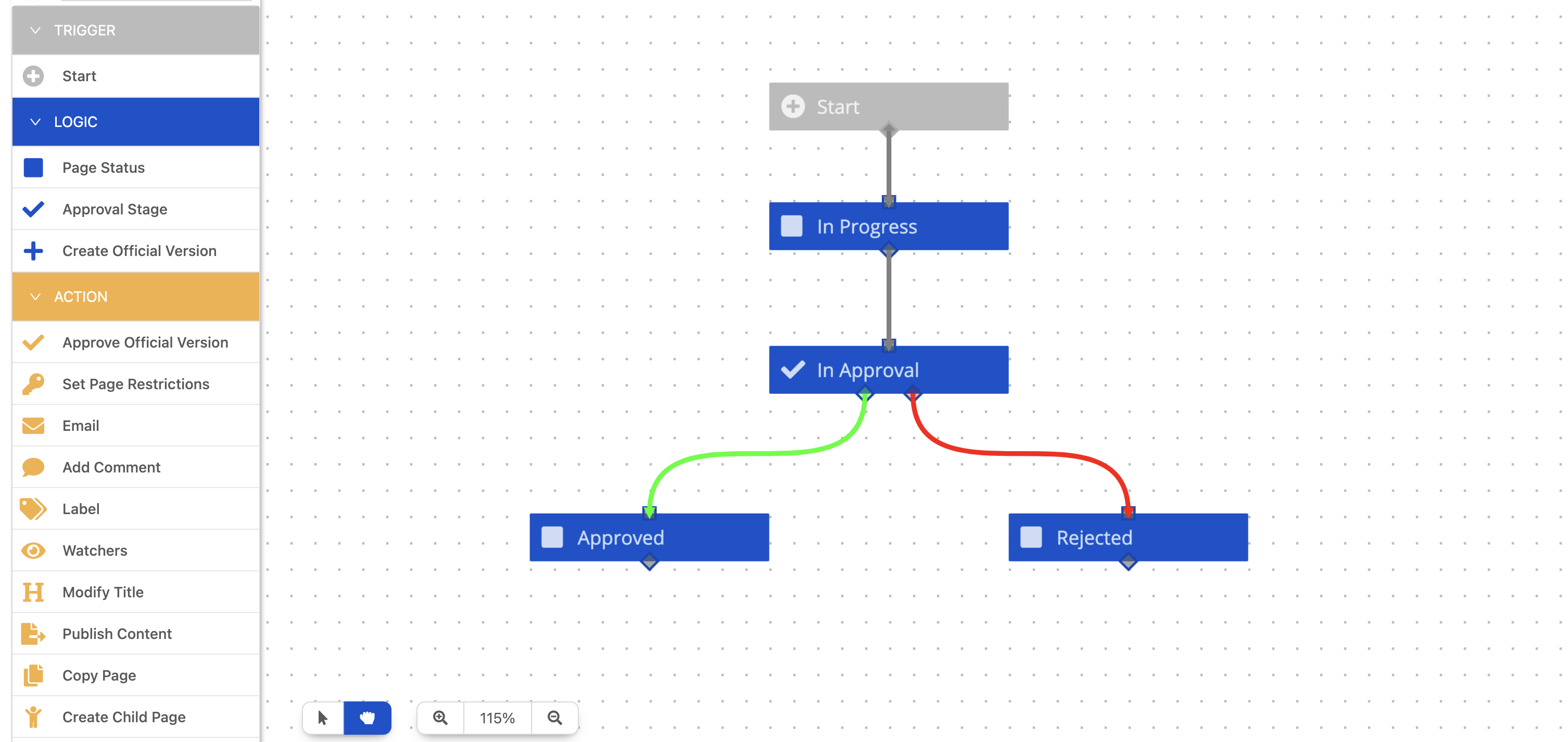 In order for a Workflow to be created and saved, the workflow must contain a Start (Trigger) step that is attached to a Status step. This represents the starting point of the workflow and enables the workflow to be initiated and used on a page.