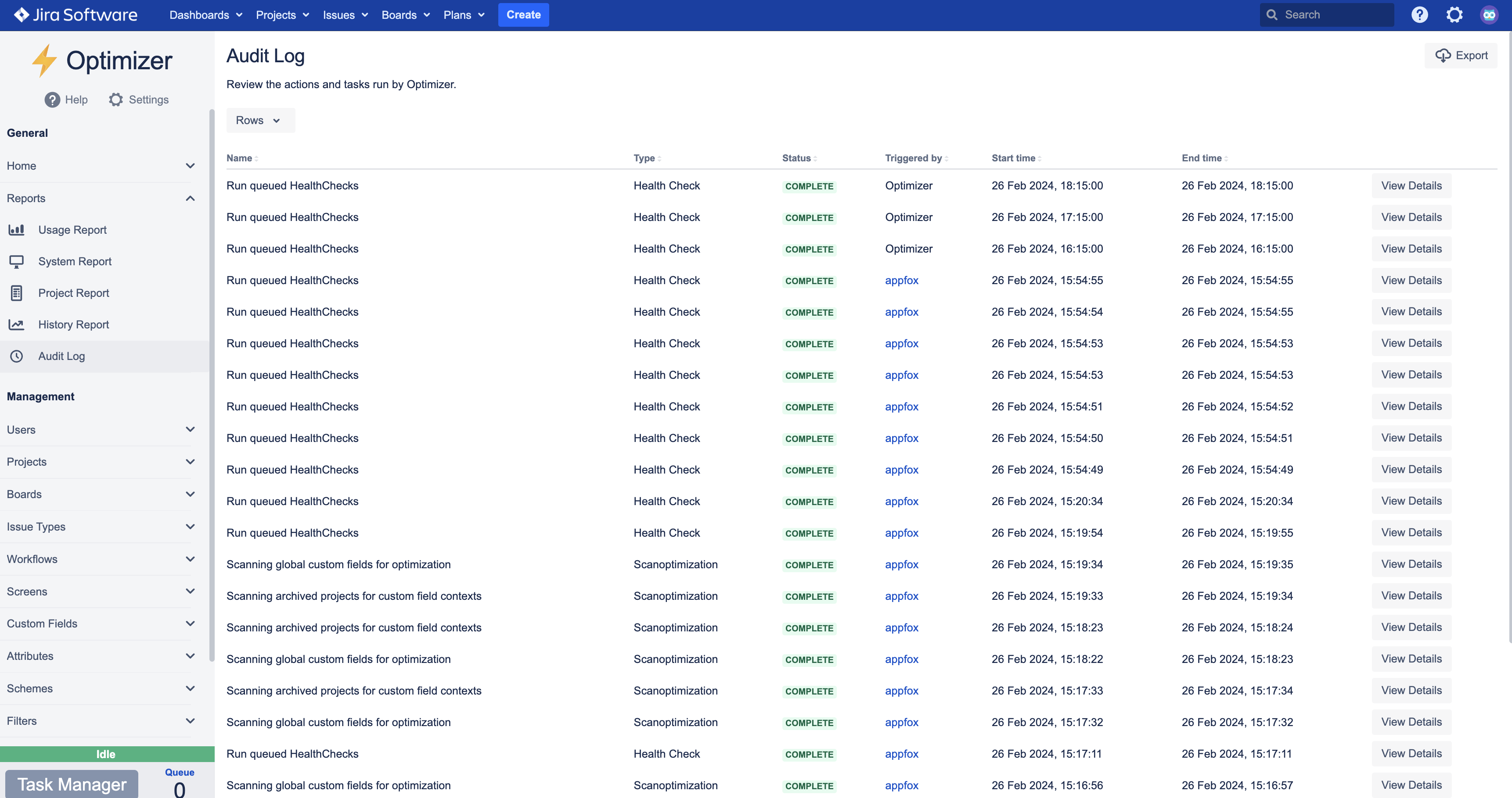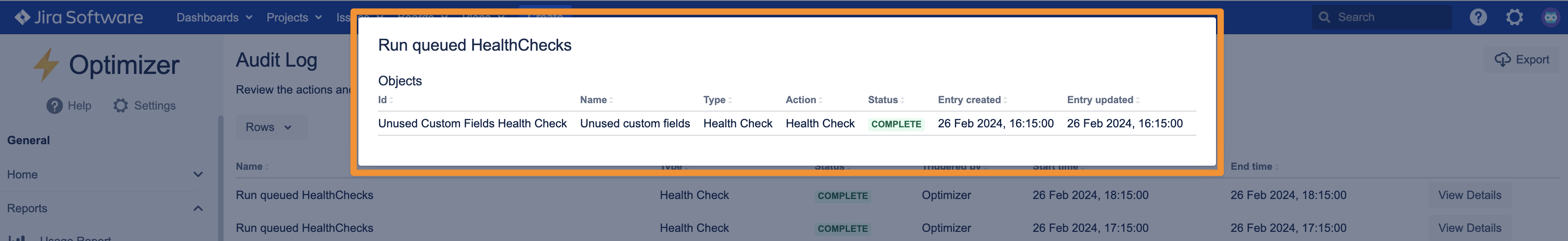 Get a detailed view of the task that was run by Optimizer for Jira