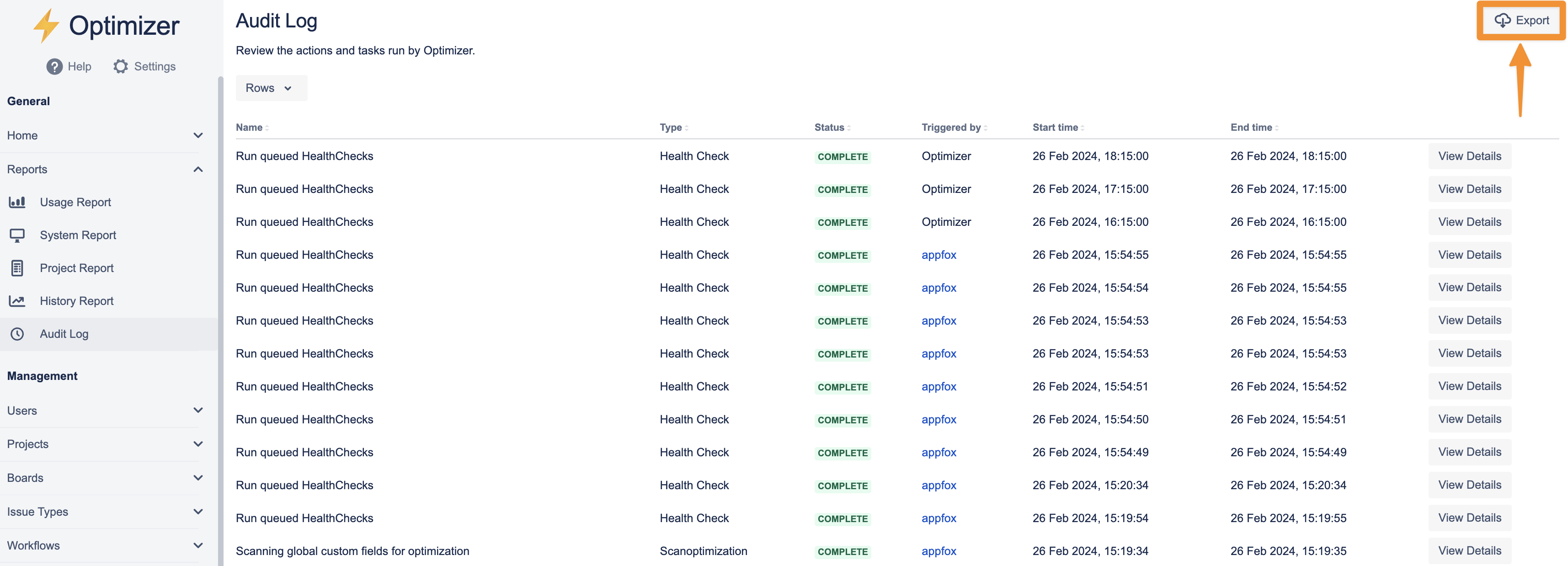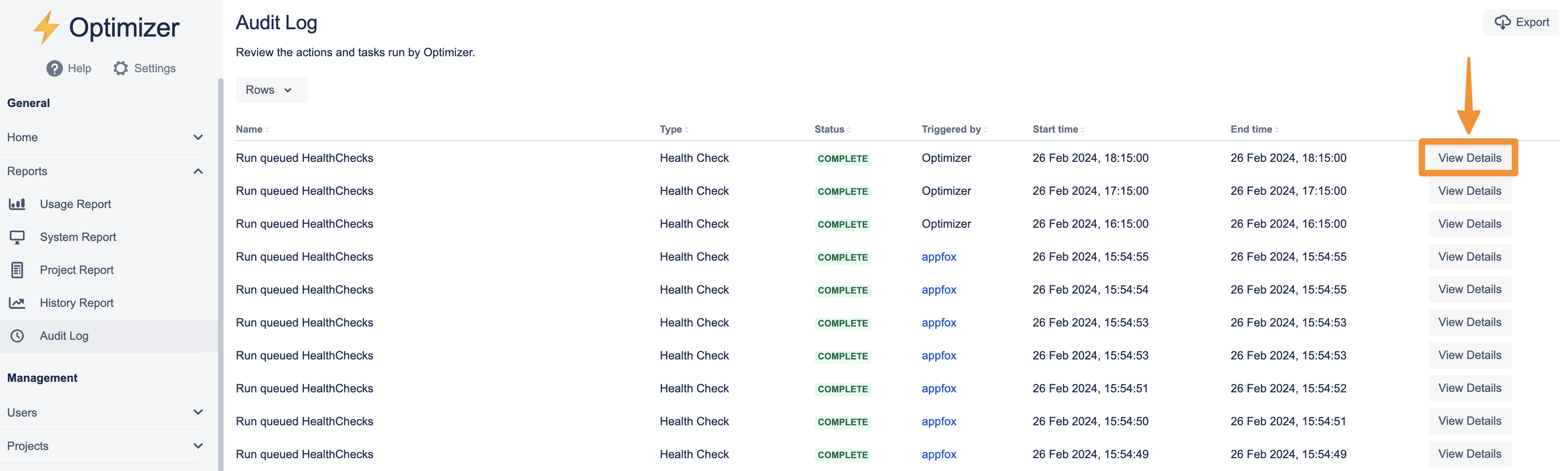 You can easily examine a task in the Audit Log to find out more details. For example, you can see which Health Checks have been run as part of a task or which Projects were deleted. To examine a task in depth, click on the View Details button on the right side of the table row for the relevant task.
