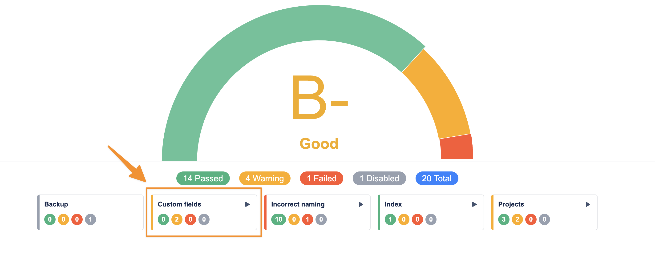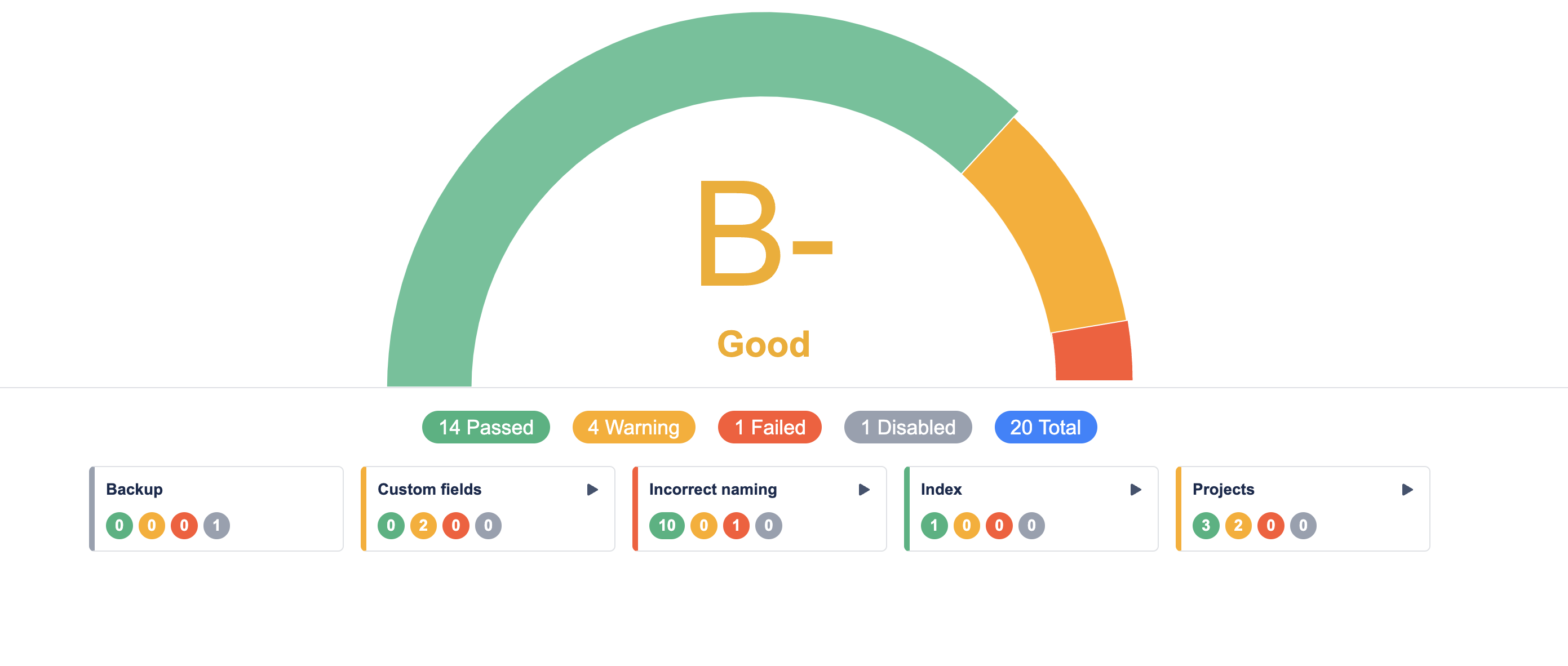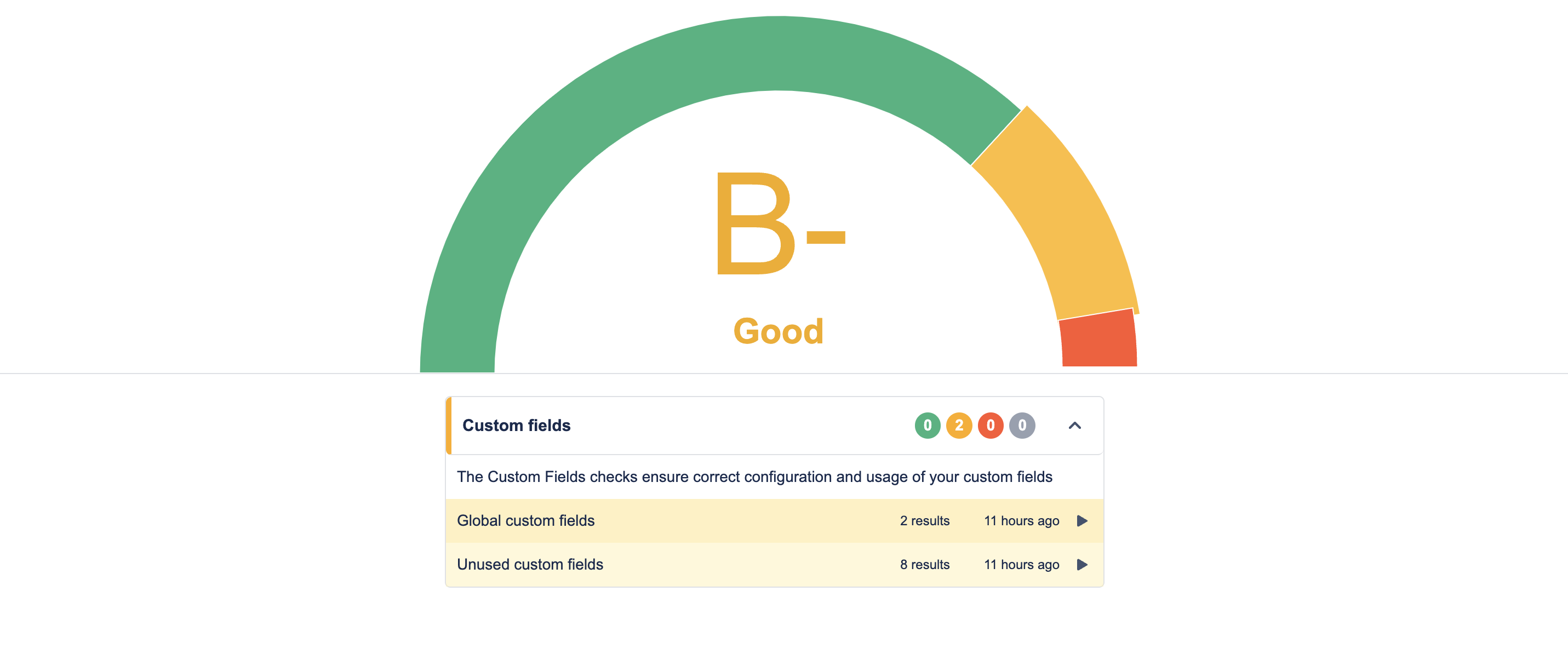 The grade is calculated from the number of Health Checks that have failed or have warnings and provides a good indicator of the health of your Jira instance.