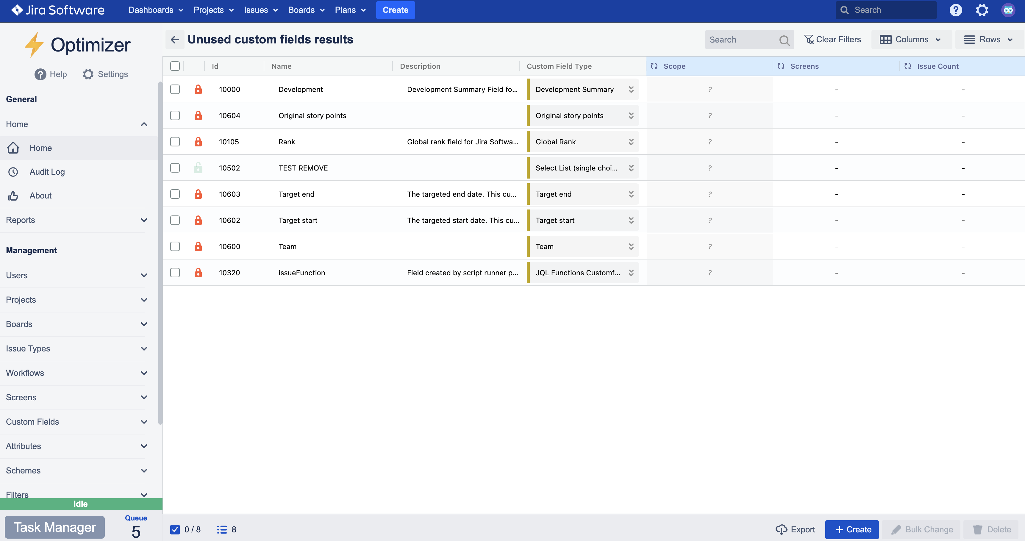 The unused Custom Fields detected by Optimizer for Jira