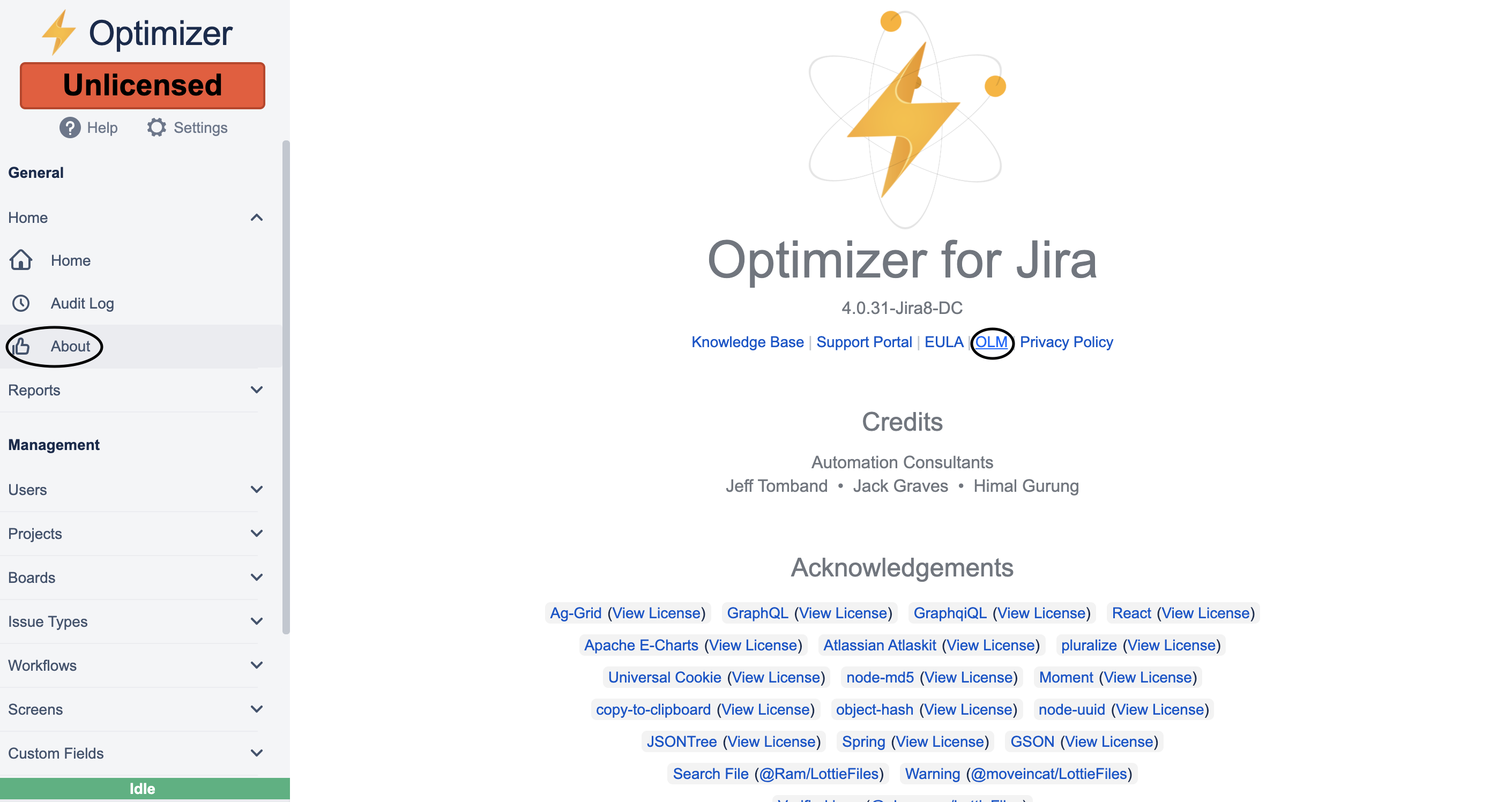 Alternatively, you can also access Optimizer License Manager from the OLM link in the About page.