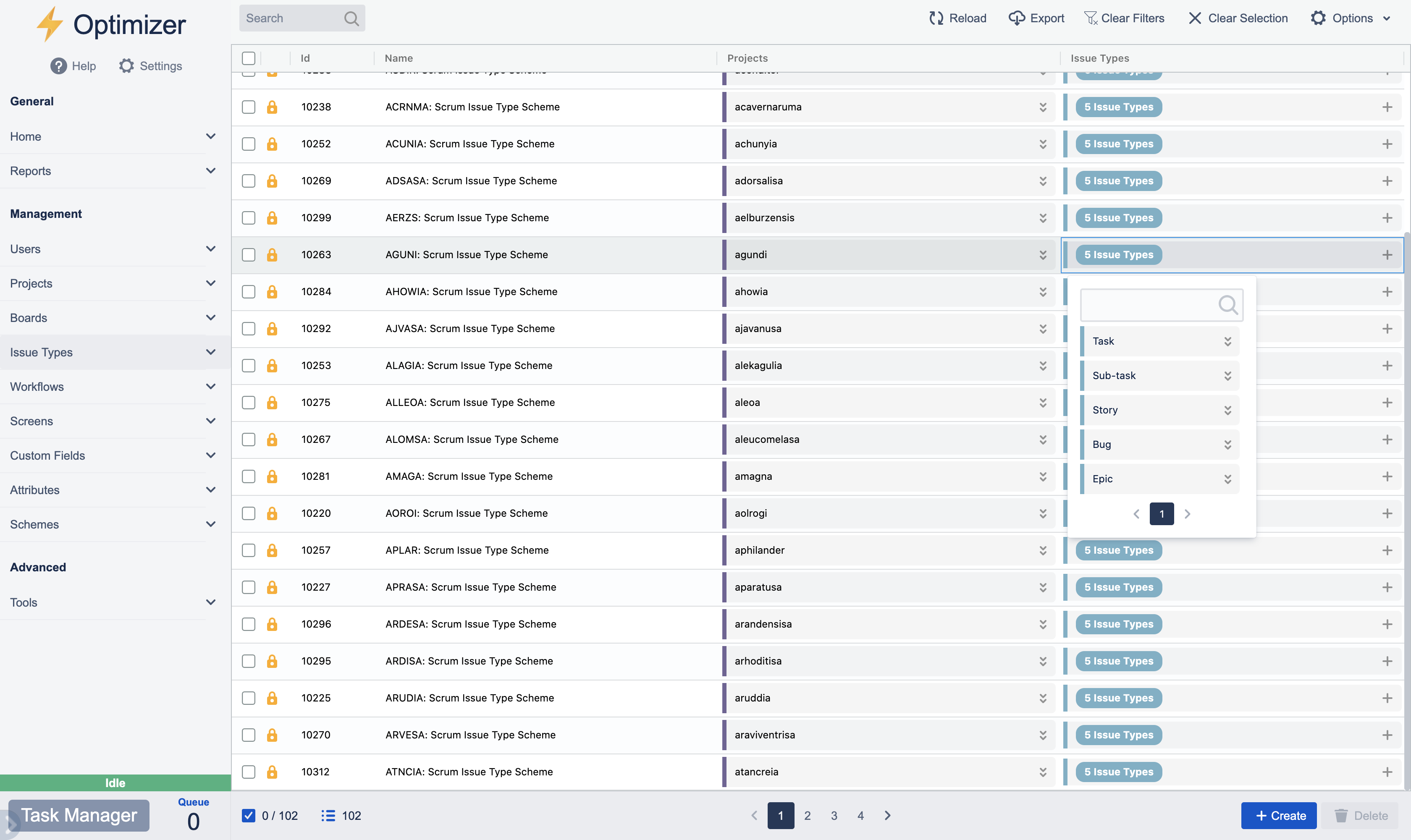 The Issue Type Schemes page allows you to view, analyze and delete in bulk any Issue Type Schemes on your system.