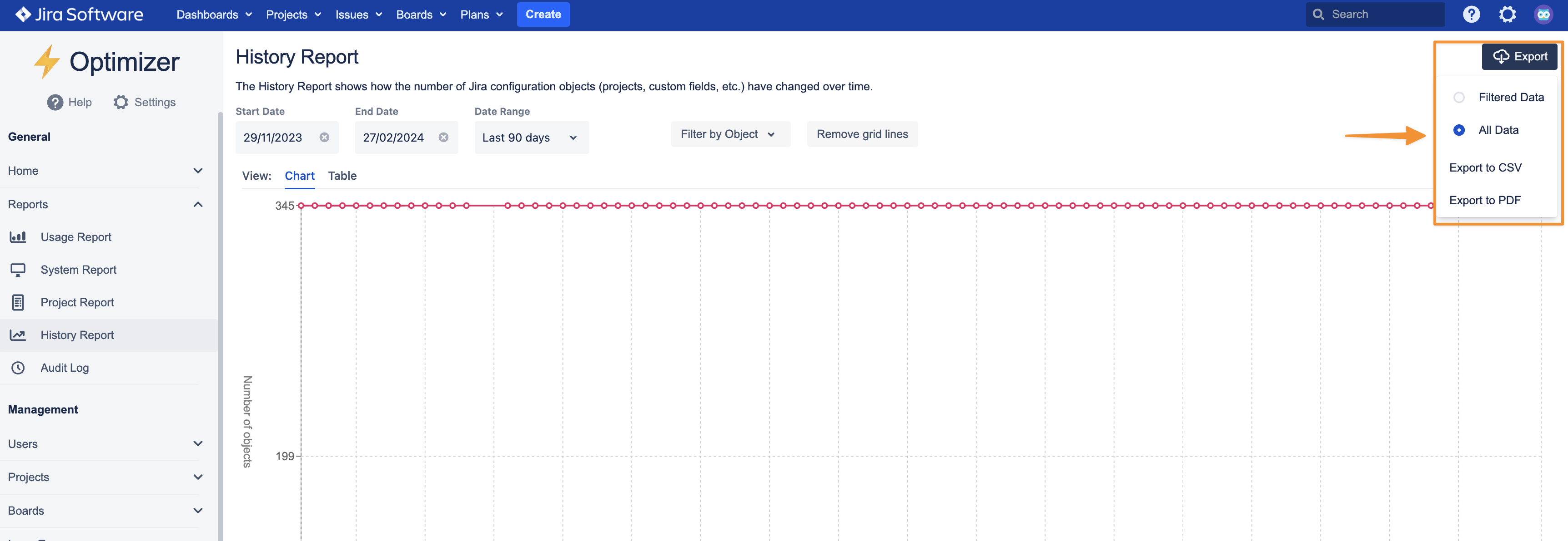 To customize an export, first, select the relevant filters for the data (for example, some reports allow a date range and relevant objects to be selected). Then, click on the Export button in the top right of the page, ensure the Filtered Data option is selected and select the desired export format.