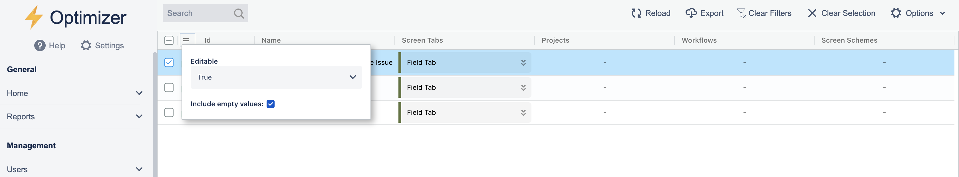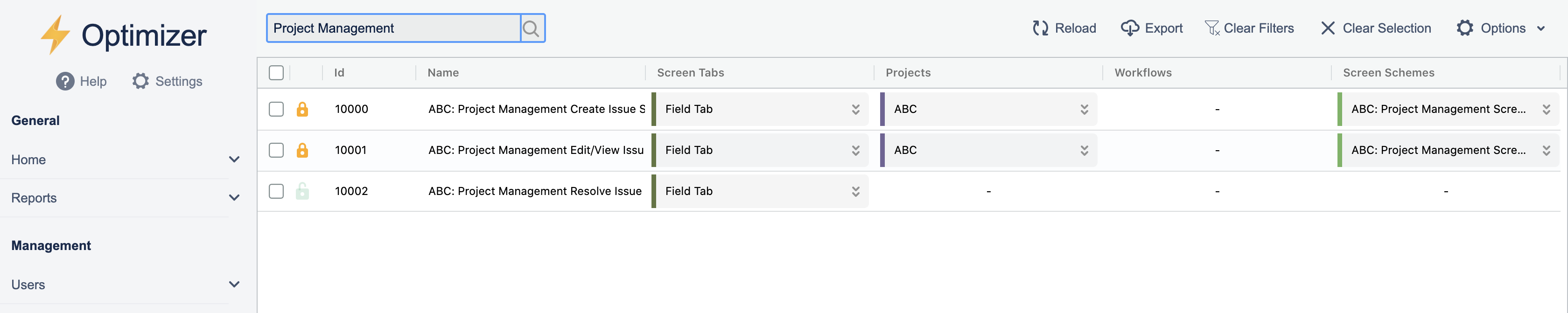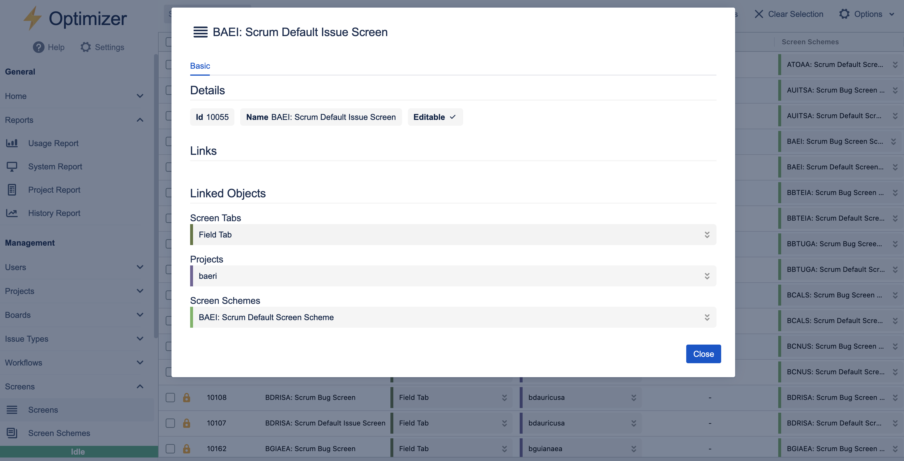 The Screens page in Optimizer gives you a detailed overview of your Jira Project Screens, including information such as Screen Tabs, Projects, Workflows, Screen Schemes, ID, name, and editability indicator.