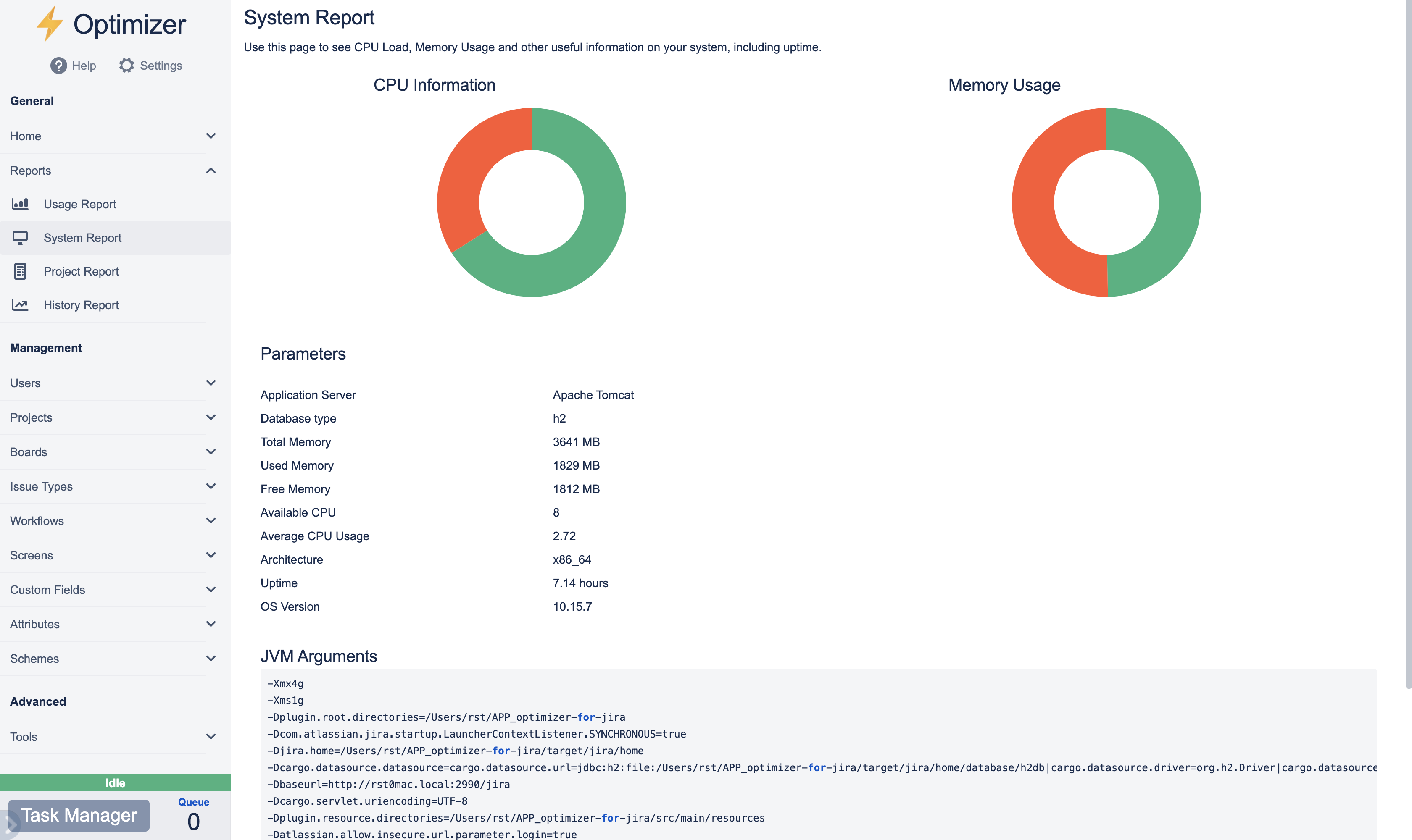The System Report page gives you at-a-glance overview of the utilization of computational resources (CPU, Memory, etc.) as well as system information (e.g., OS version) about the server that runs Jira.