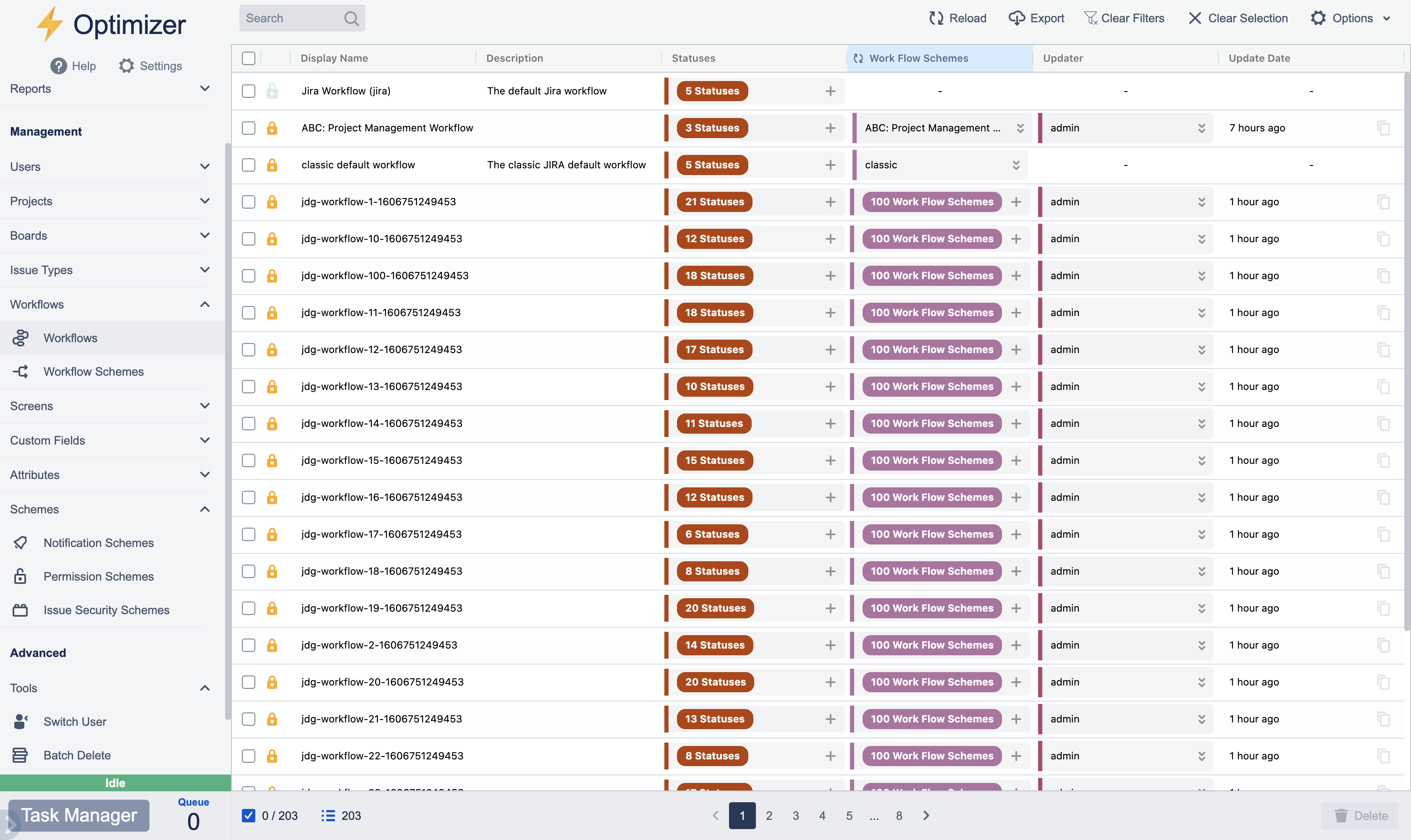 A Workflow Scheme defines the mappings between a Workflow and an Issue Type. The Optimizer’s Workflow Schemes page gives you detailed information about the utilization of Workflow Schemes in Jira. It provides details such as: