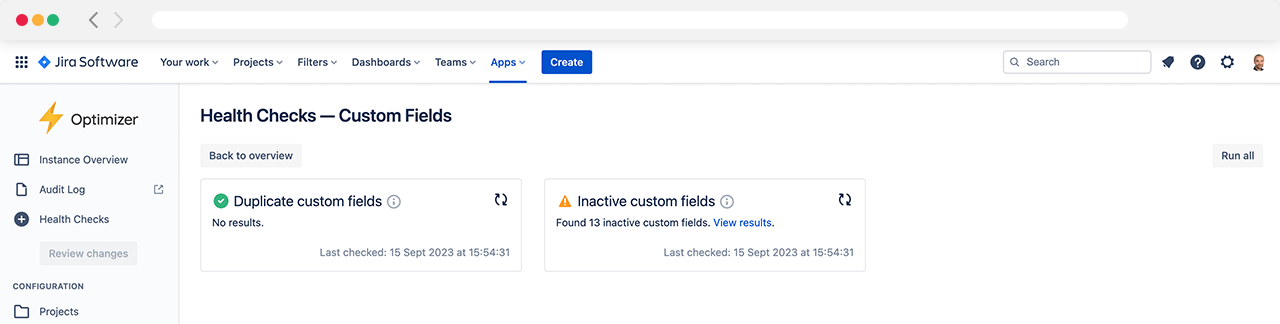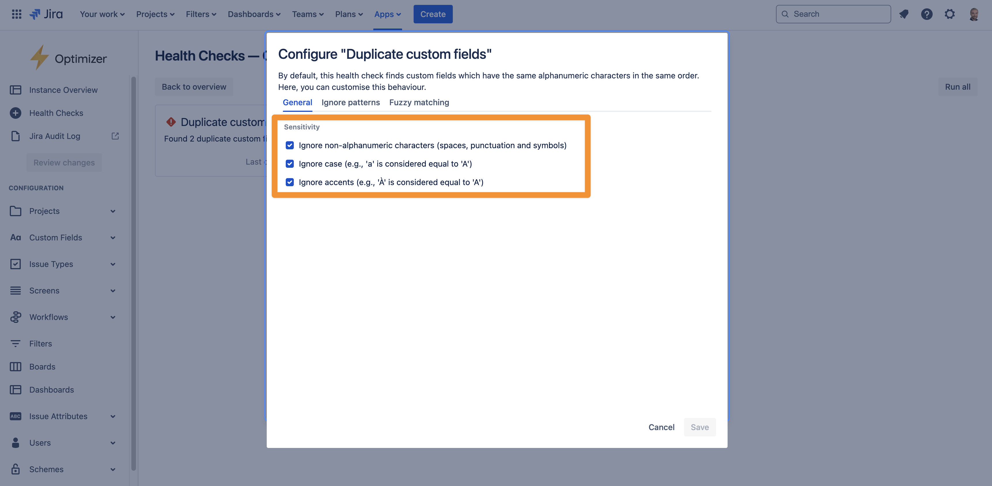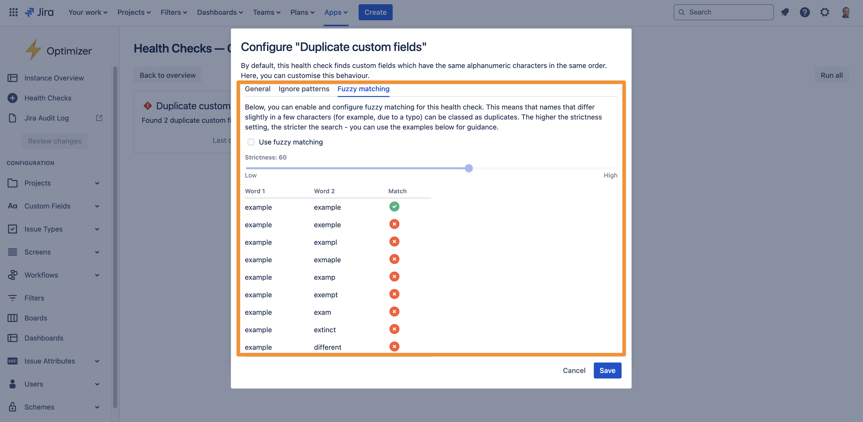 The ‘Duplicate custom fields’ health check detects custom fields with identical or very similar names. There are many customisation options available, allowing you to control the rules used to determine whether fields should be considered duplicates.