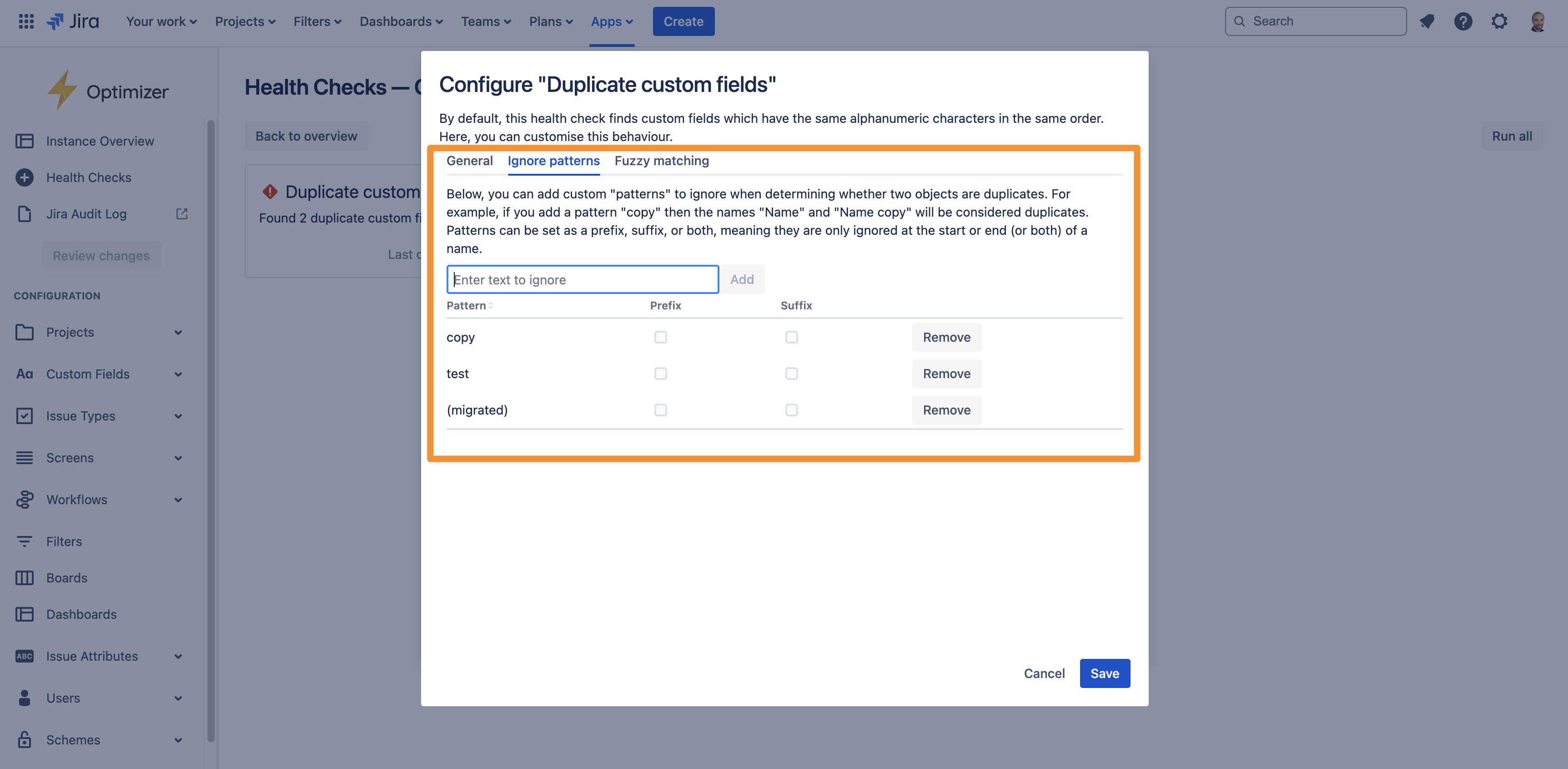 Each pattern can be included as a prefix, suffix, or both. For example, if you add a suffix to ignore the pattern of “(migrated),” then the duplicate custom fields health check will mark the fields “Cost” and “Cost (migrated)” as duplicates. This can be especially helpful if you have used the Jira Cloud Migration Assistant to migrate your instance from Jira on-premise to Jira Cloud since it can introduce many such duplicate objects
