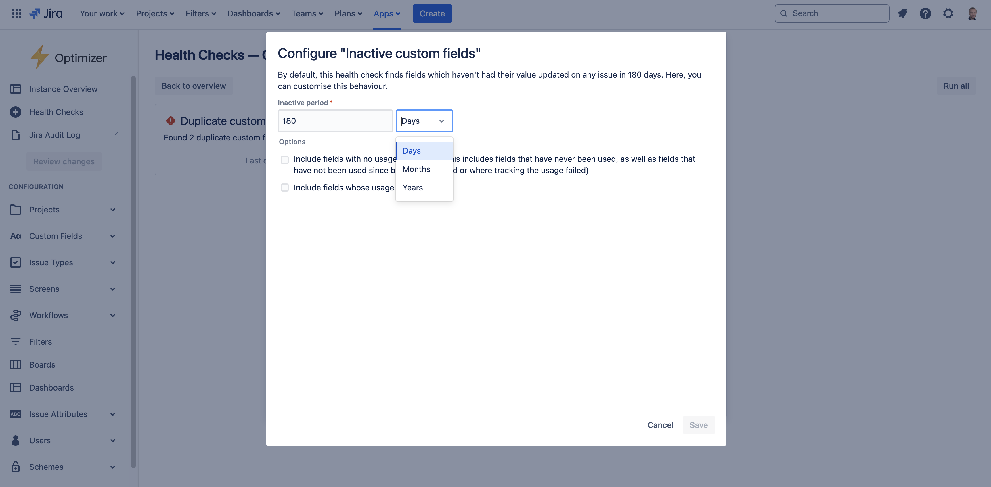 The ‘Inactive custom fields’ check scans for custom fields whose value has not been changed on any issue recently. By default, this includes fields whose value hasn’t changed in 180 days, but you can adjust this value to any number of days, months, or years, as shown in the image below.
