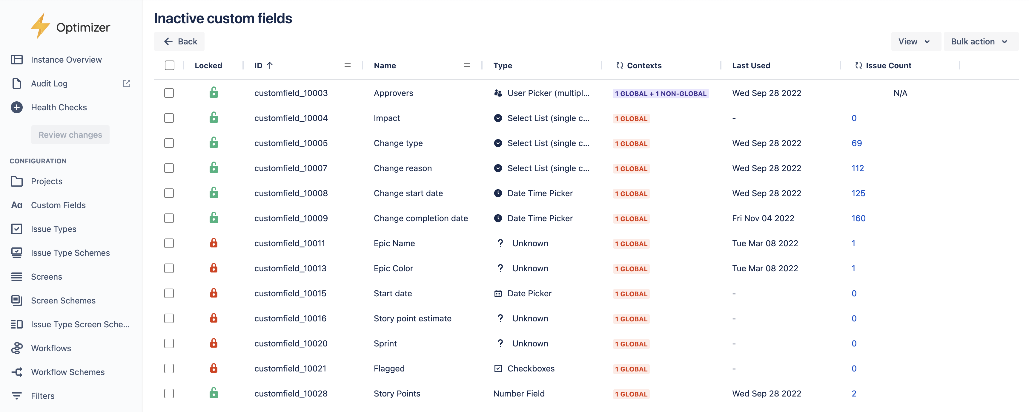 The Health Checks for Custom Fields includes the following checks: