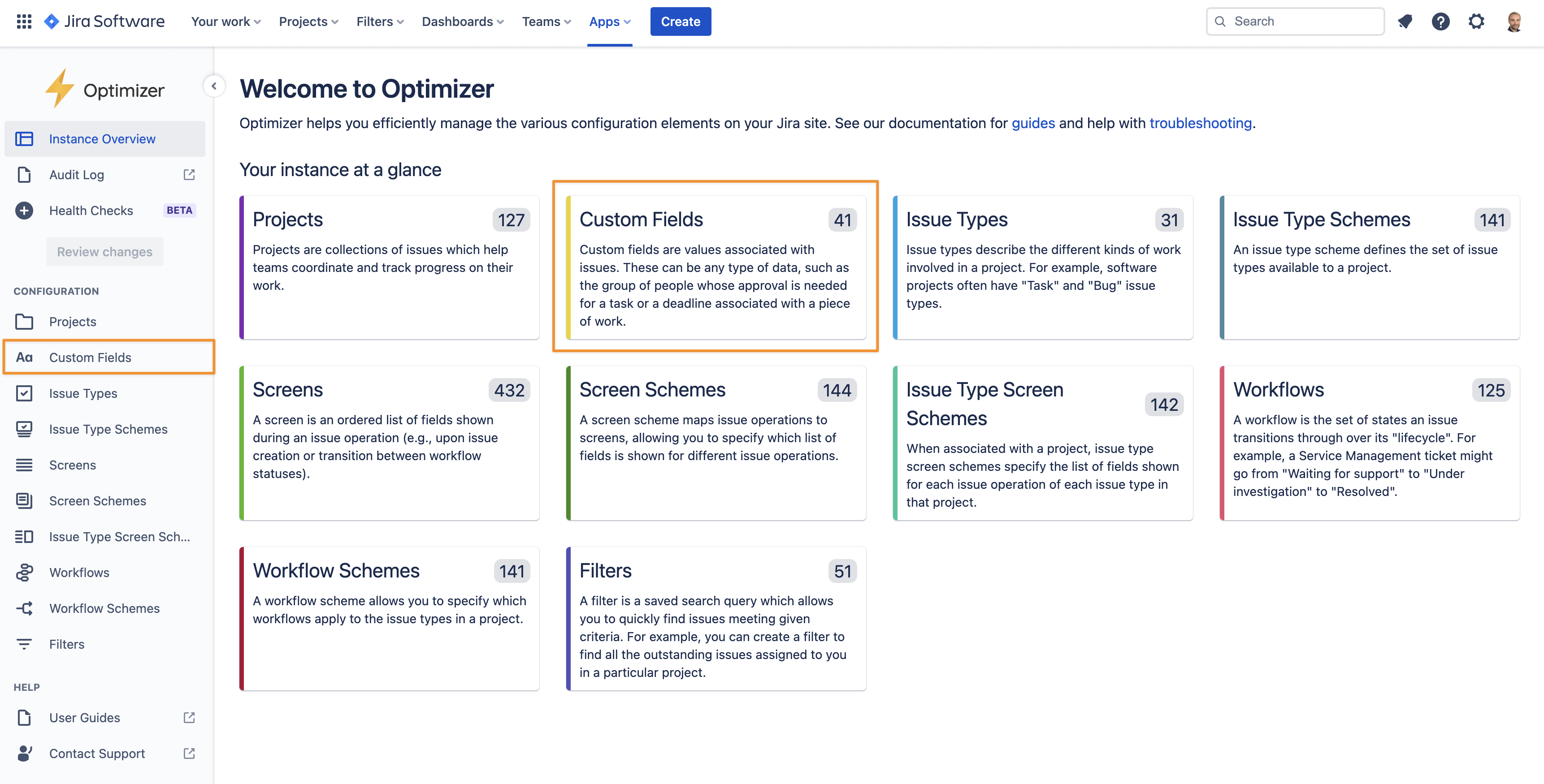 The first thing you will want to do in Optimizer is get a feel for the state of your Jira instance. The Instance Overview section of Optimizer is a popular feature and gives you a helicopter view of how many projects and configurations are in your instance.