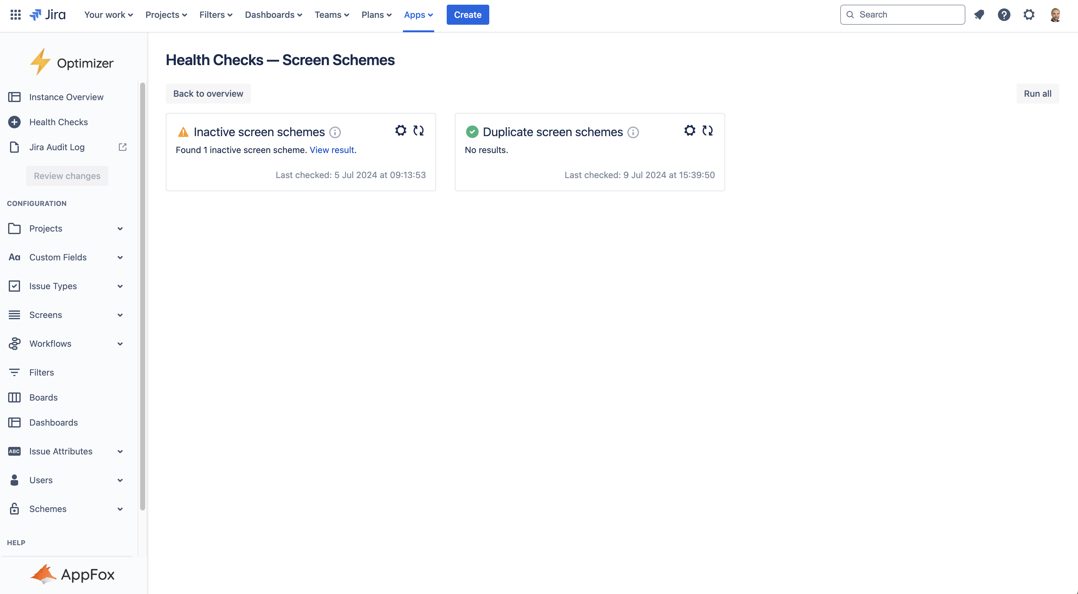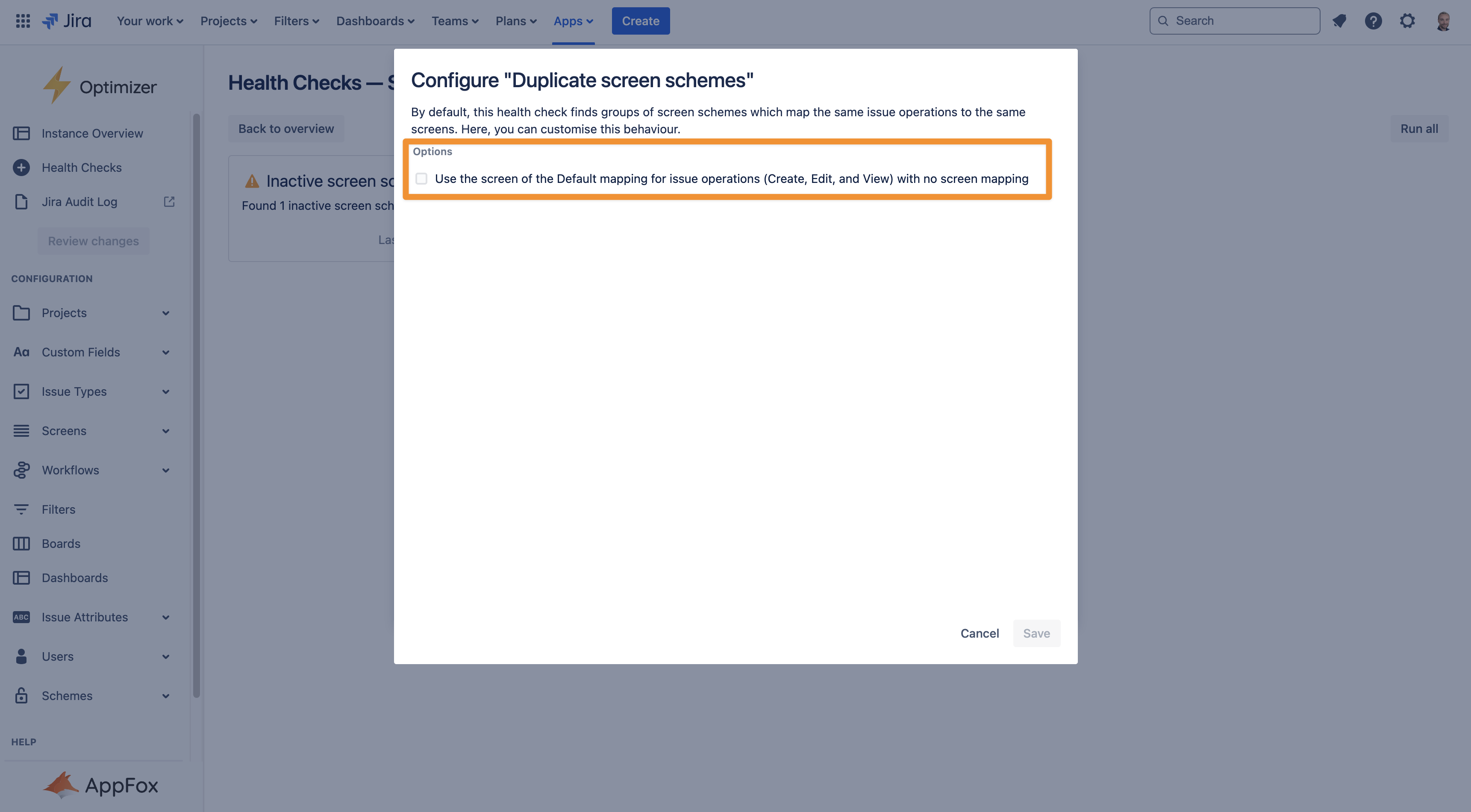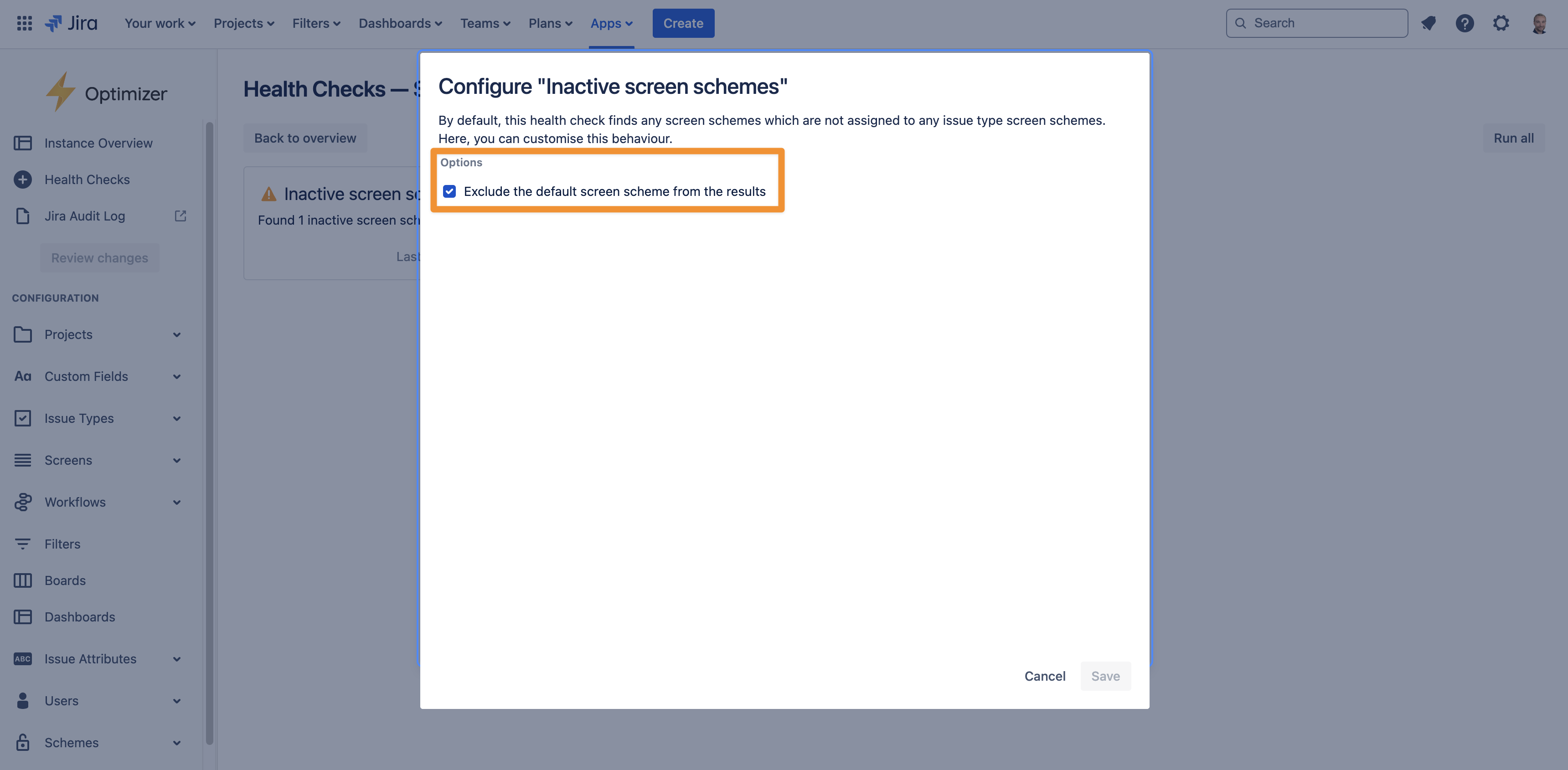 The ‘Inactive screen schemes’ health check detects screen schemes not used in any issue type screen schemes. Note that the default screen scheme is excluded from results by default, but you can adjust this behaviour by unticking the option in the health check’s settings (see below).
