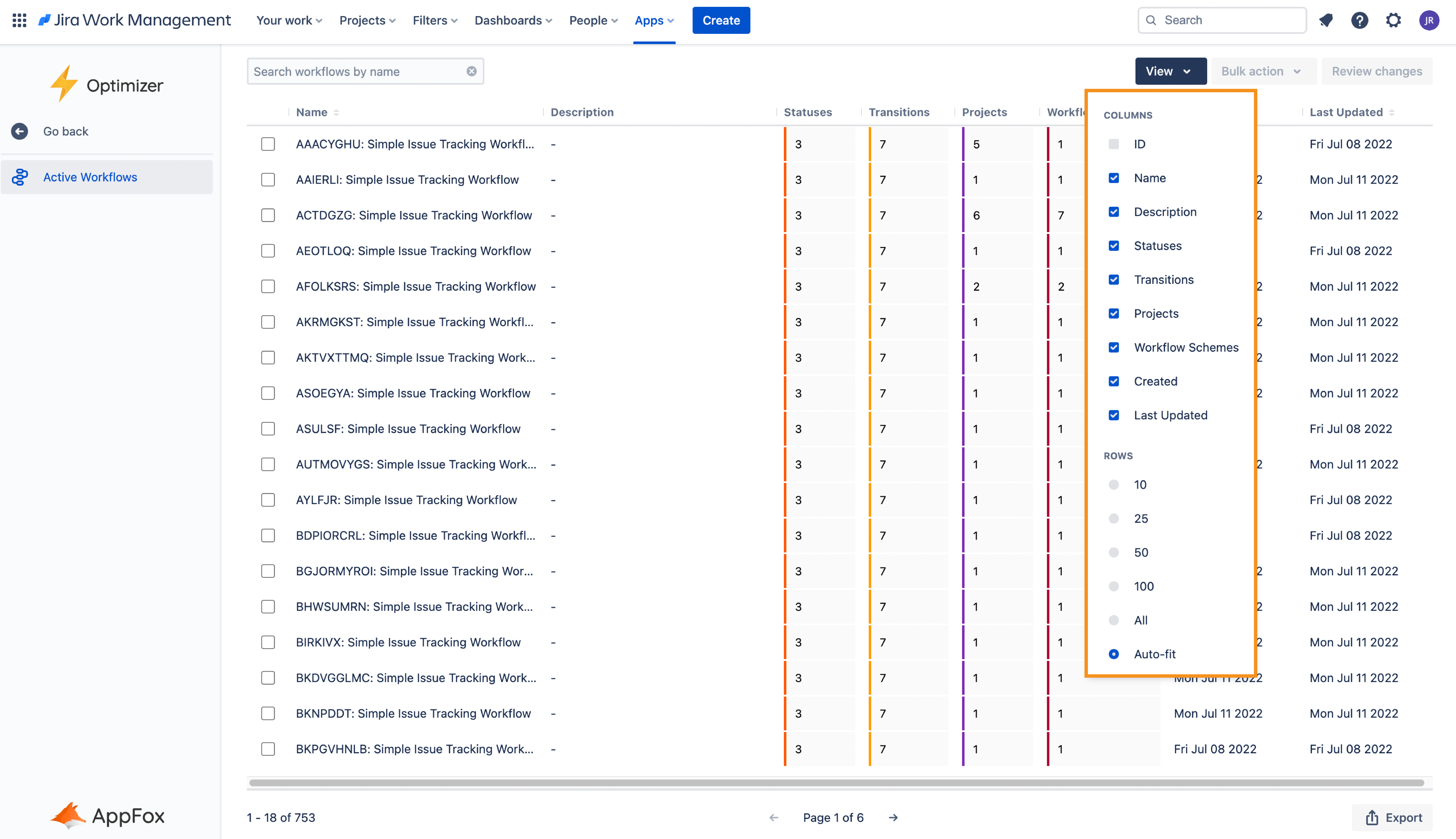 The Workflows smart table in Optimizer for Jira