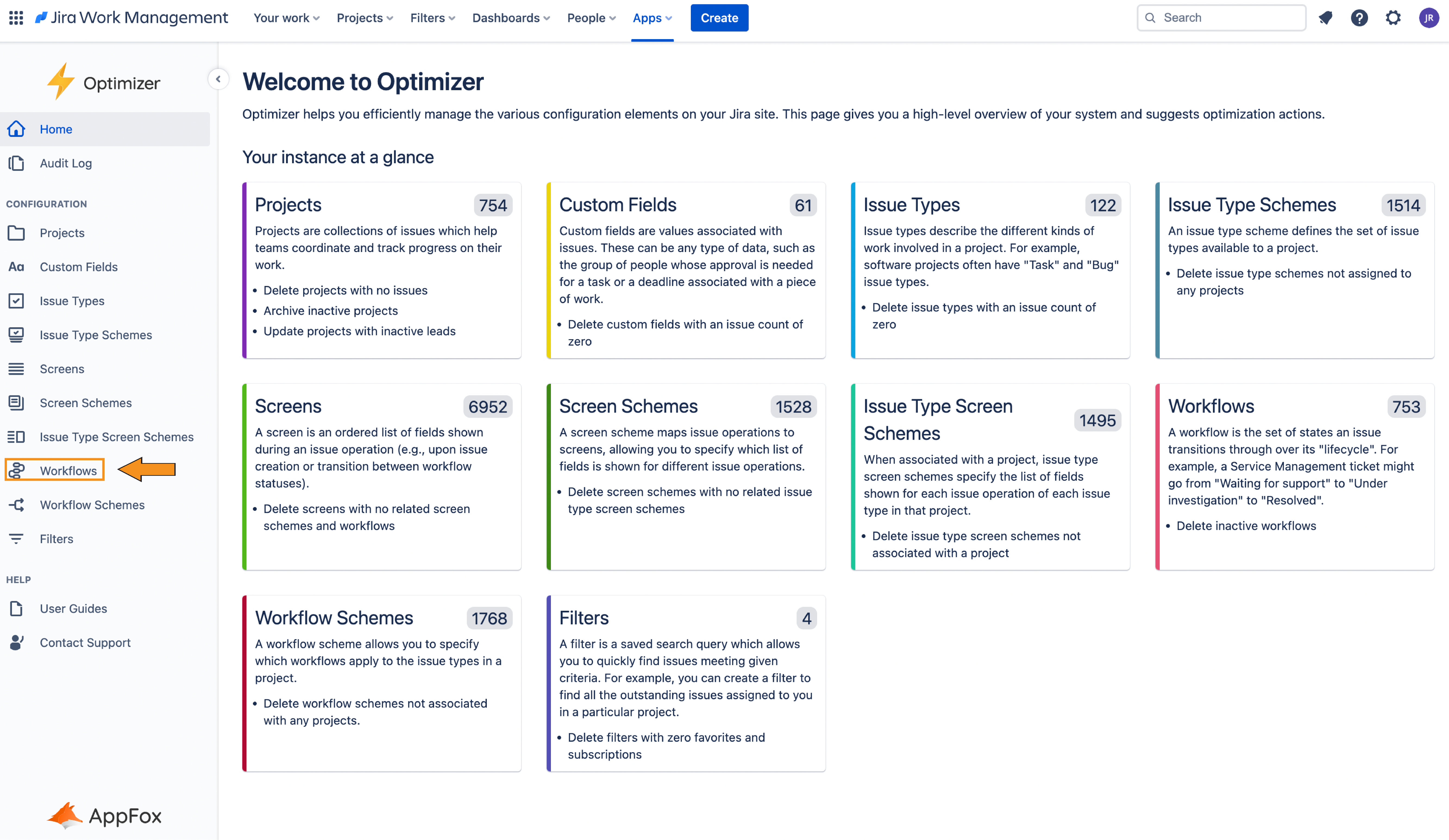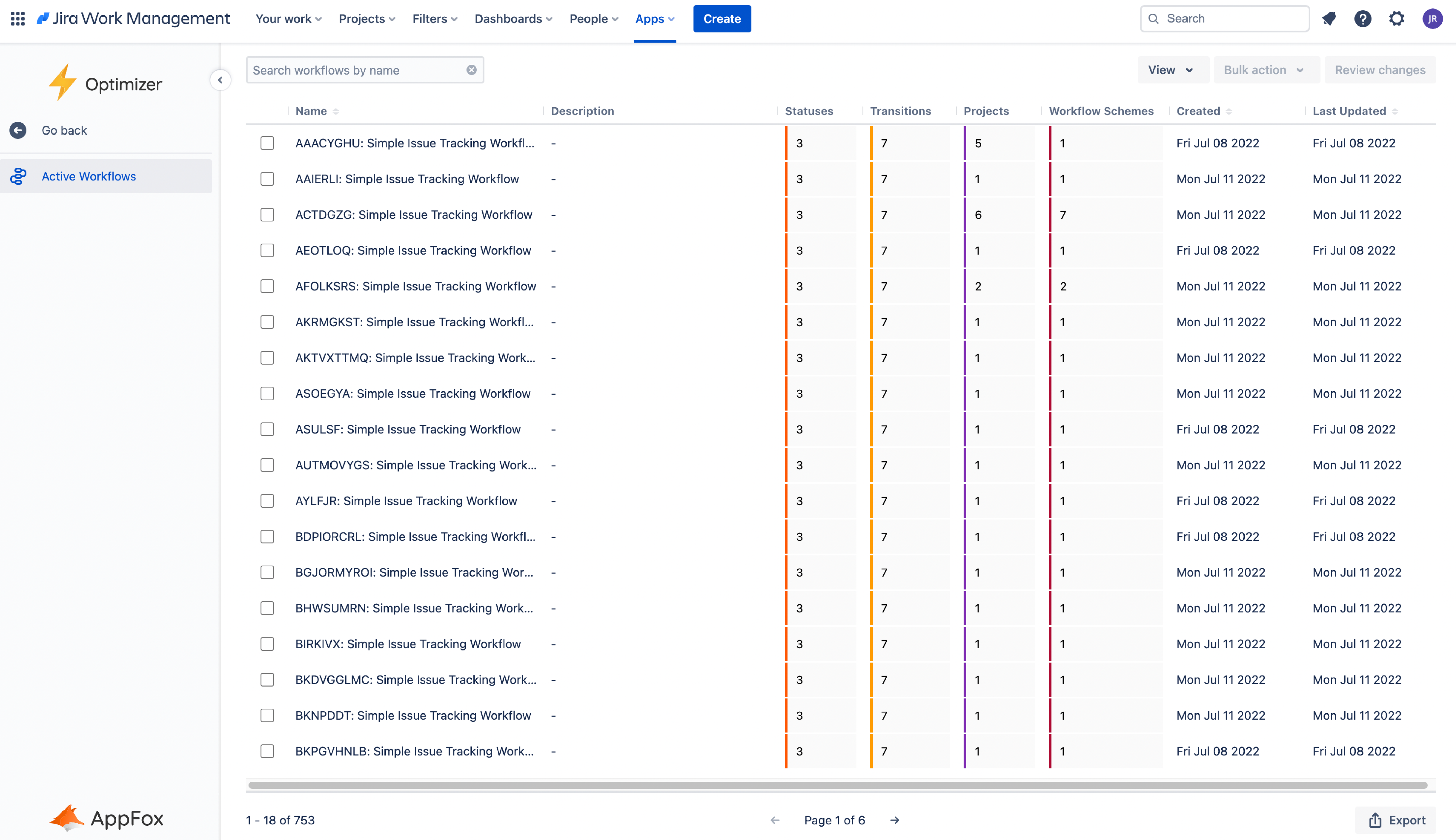 Optimizer will display all of the Workflows in your Jira instance in one Smart Table. This is a great way to get a birds-eye view of all the Workflows in Jira and identify any areas for improvement